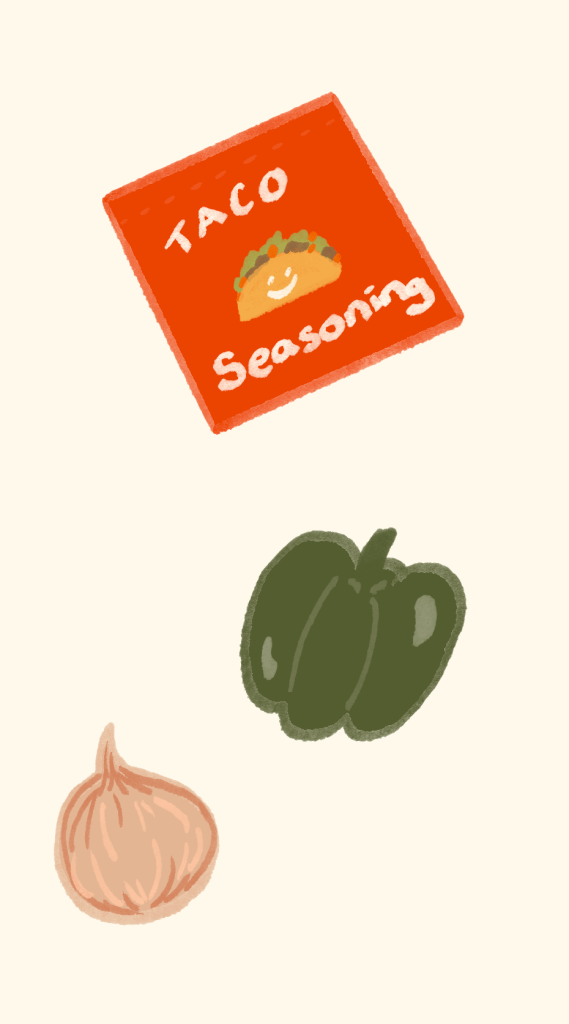 -taco seasoning measured to your taste (I buy premixed, if you want to make from scratch add chili powder, garlic, salt, pepper, turmeric, cayanne, and cumin together)